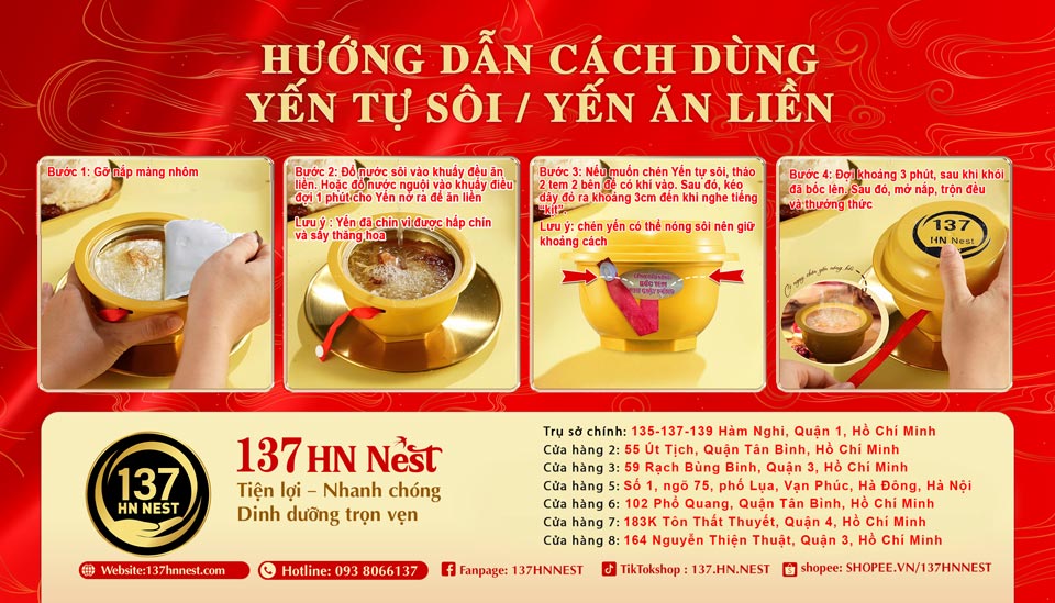 Thưởng thức: Chờ từ 3 - 5 phút để quá trình tự chưng hoàn tất, mở nắp và cảm nhận hương thơm cùng sợi yến dai giòn.